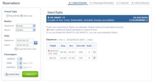 9月に韓国から帰国する際の航空券を探してたのですが、、、 最近就航したエア釜山。 ためしに検索してみました。 釜山-大阪の片道料金が、 18,260.0USD (約161万円)って出てくるんですけど(笑) TAX等込みだと、21,297.8USD(約187円)。 ま、(220,000KRW…