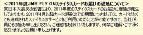 JALのサイトに <2011年度JMB FLY ONステイタスカードお届けの遅延について> 東日本大震災の影響により、2011年度のステイタスカードのお届けに遅延が発生しております。2011年4月以降カードが届くまでの期間につきましては、カードがなくても達成されたス…