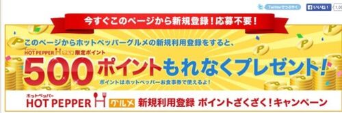 2014年2月9日(日)23:59まで http://www.hotpepper.jp/campaign/ ホットペッパーグルメアプリをインストールし、リクルートIDに新規会員登録すると、ホットペッパーグルメ限定ポイント500ポイントが貰えます。 Android用アプリ iOS用アプリ メールマガジン、…