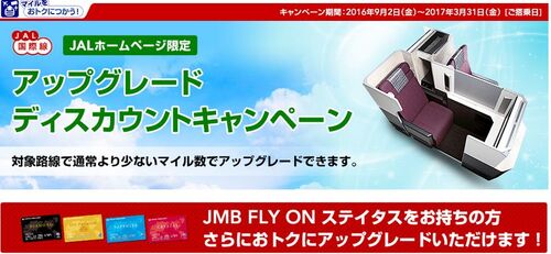 JALアップグレードディスカウントキャンペーンが開始されます。 JALマイレージバンク - JALホームページ限定 アップグレード ディスカウントキャンペーン ディスカウントマイル期間 2016年9月2日(金)~2017年3月31日(金) [ご搭乗日]※利用制限期間はご利…