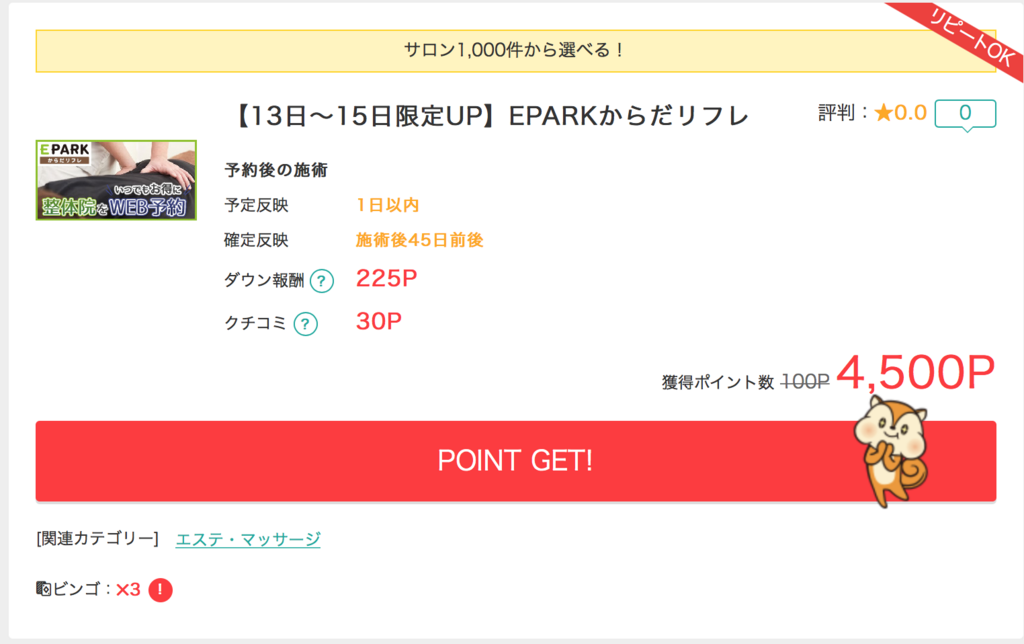 2017-12-13 リピートOK! モッピーでマッサージやエステに行くだけで4,000マイル相当のポイントゲット!! にほんブログ村 モッピーで12/15日までの期間限定で、EPARKからだリフレ案件が4,500ポイント還元で出ています! モッピーのポイントは、最大85.7%のレートでJALマイルに移行が可能です! www.yume-raku.com モッピーはJALマイル貯めるには最高のポイントサイトです!! にほんブログ村