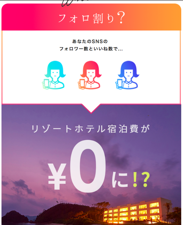 2017-12-20 フォロ割 SNSのフォロワー数に応じてリゾートホテル宿泊費が割引に ホテル修行 お得情報 旅行(修行以外) にほんブログ村 面白い仕組みですね! 僕の場合、 Twitter twitter.com Facebook Instagram って感じなので、これで18,000円の割引!? &ホテルまでの送迎付きって感じかな。 にほんブログ村