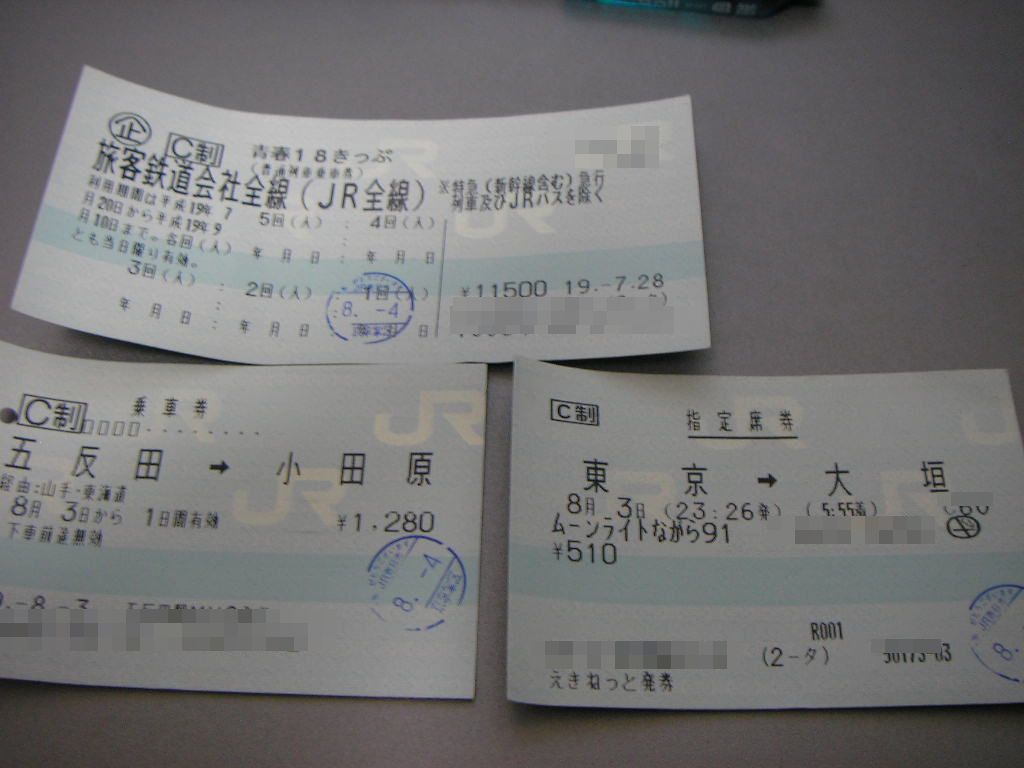 写真は18きっぷと、先日使った大垣行き夜行列車ムーンライトながらの指定席券、その際につかった小田原までの切符です。