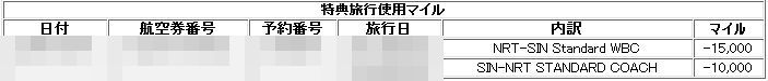 6/X NRT-SIN ワールドビジネスクラス -15,000マイル