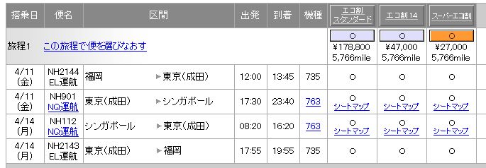 たとえば、FUK/xTYO/SIN/xTYO/FUK といった感じで国内線を切り込んでも同じ値段だったりします。