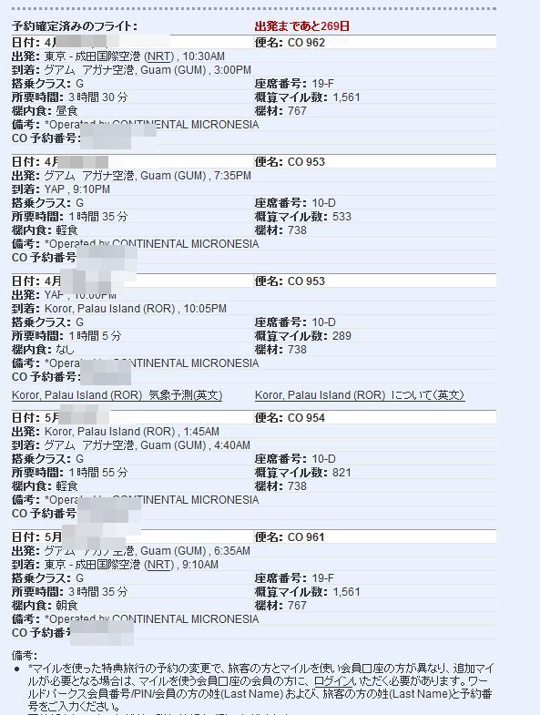 NWワールドパークスのマイルを使用して、コンチネンタル航空利用で行ってきます。