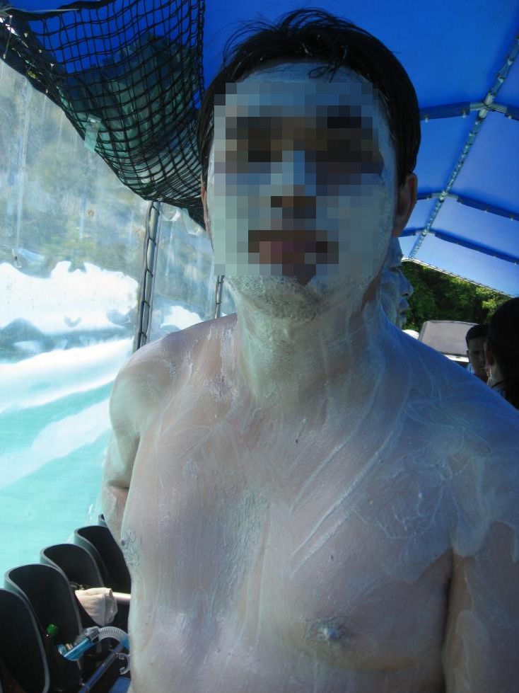 ツアーの人が潜って泥をすくってきたのをバケツに入れること数回。その泥を顔や体に塗りたくってしばらくしてから海に飛び込みます。