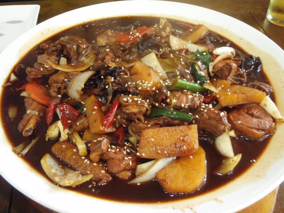 醤油ベースのタレに鶏、玉ねぎ、唐辛子、じゃが芋、人参などの野菜と、春雨が入った、甘辛い感じの味付けのヤツ。