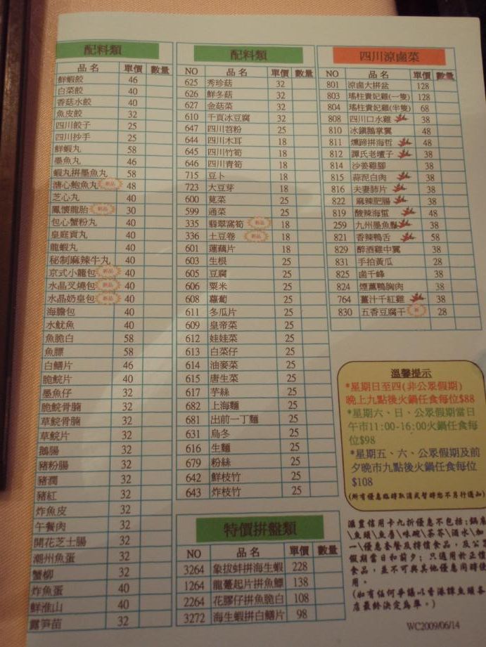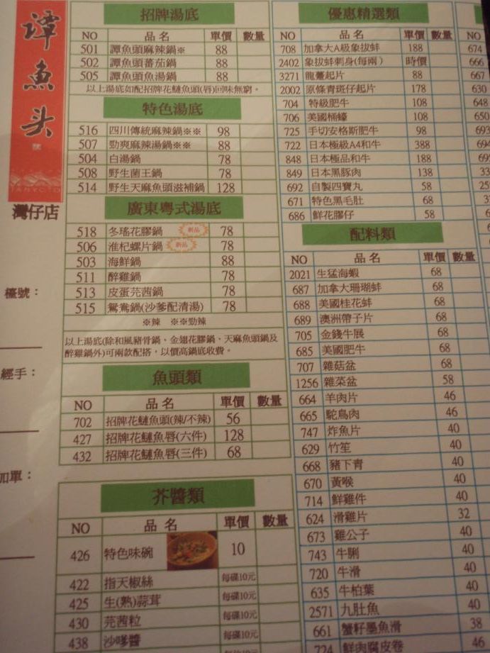2009-07-21 火鍋 グルメ 旅行(修行以外) 香港での夕食は、香港地下鉄(MTR)のワンチャイ(灣仔)駅出口A3からすぐの「譚魚頭 火鍋(Tanyoto Restaurant)」。 トマトスープの火鍋&辛いやつ(麻辣なんとか)を注文。 オーダーシートに記入して注文します。 なかなか美味でした。 満腹・・・・ http://www.openrice.com/restaurant/sr2.htm?shopid=1025 メニュー。 メールマガジン発行中です!登録お願いします。 http://www.mag2.com/m/0000238211.html 続きを読む前にワンクリックお願いします。 ↓↓↓ ブログランキング ブログ村