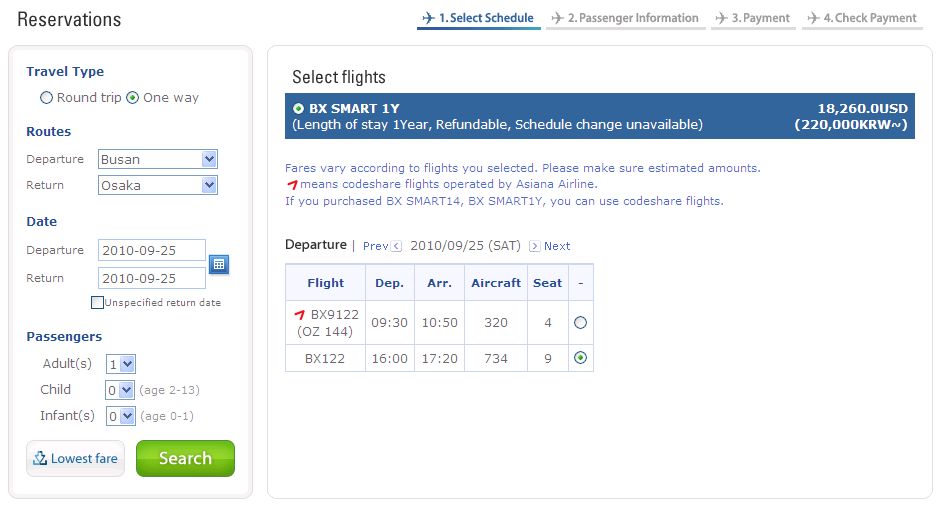 釜山-大阪の片道料金が、 18,260.0USD (約161万円)って出てくるんですけど(笑)