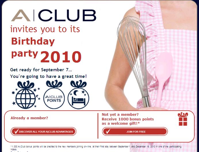1,000 A|Club bonus points will be credited to the new members joining on-line, at their first stay between September 1 and December 19, 2010 in one of the participating hotels.