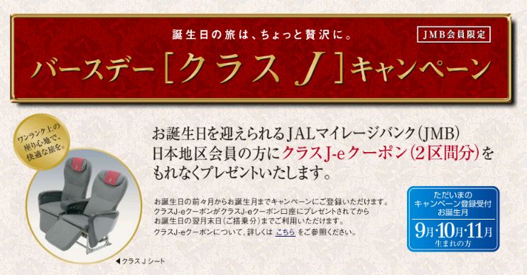 誕生日月前後に、クラスJ-eクーポンを2枚(2区間分)、プレゼントしてくれるという企画です。