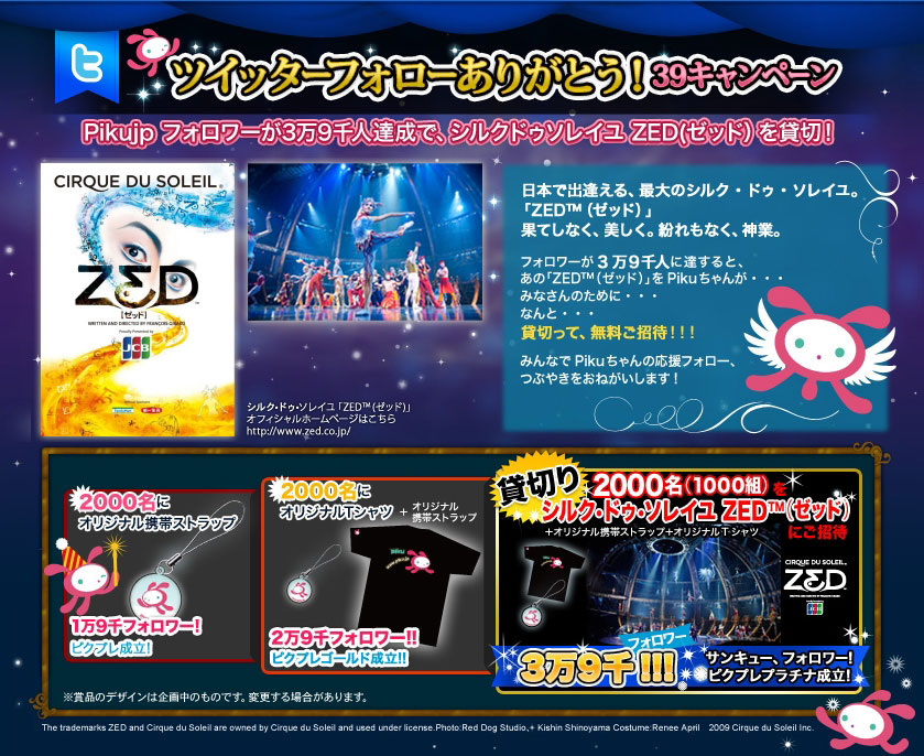ピ ク メディアのツイッター公式アカウント<Pikujp>をフォローして、期間中にフォロワーが3万9千人に達すれば、シルク・ドゥ・ソレイユZED(ゼッド)を貸切り、抽選で1,000組(2,000 名)をご招待。という内容です。