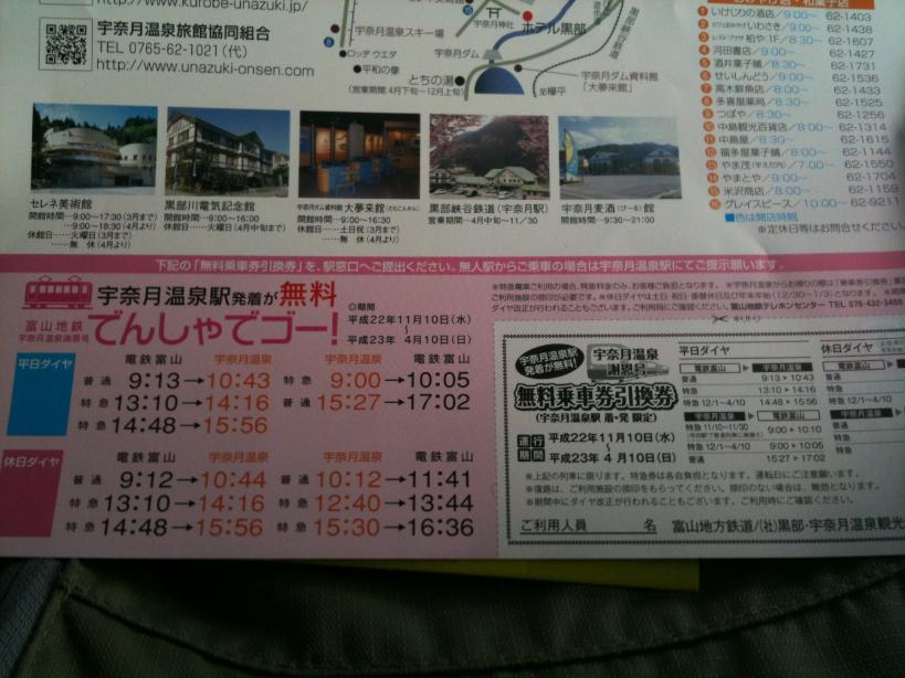 というものを発見。なんと、通常往復で3,580円かかる、電鉄富山-宇奈月温泉間が無料(指定列車に限る)になるという企画。