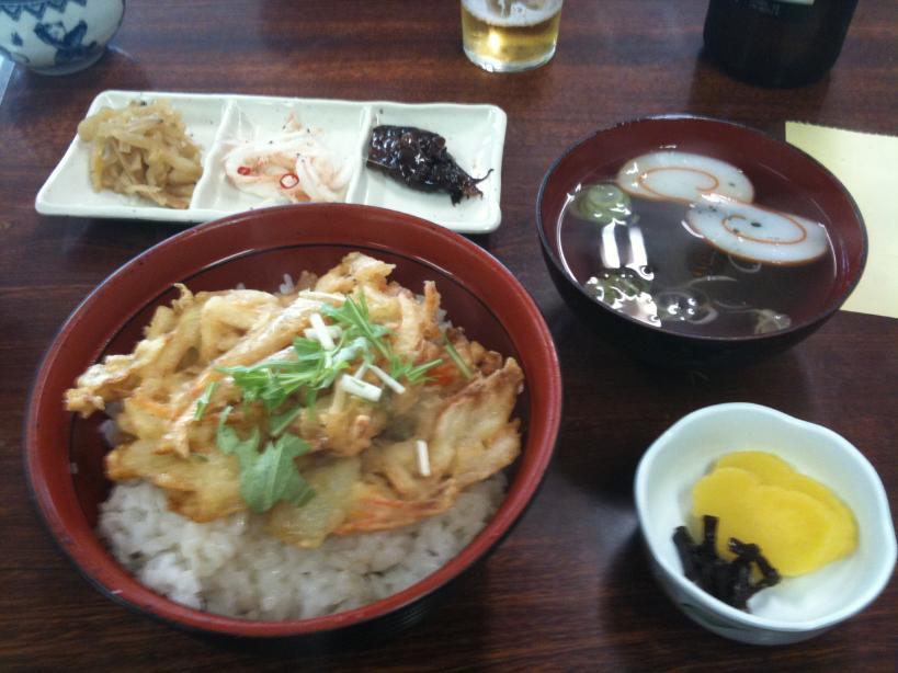 駅前のお店「レストプラザ柏や」で、名物白海老のかき揚げ丼セット(1,400円)を。