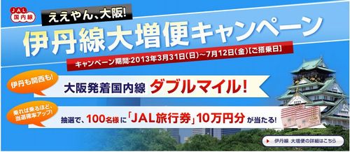 2013-03-13 JAL大阪発着国内線 ダブルマイル キャンペーン期間 2013年3月31日(日)~7月12日(金) 対象路線 JALグループ国内線 大阪(伊丹・関西)発着路線 対象運賃 フライトマイル積算対象運賃 メールマガジン、是非登録お願いします。 http://www.mag2.com/m/0000238211.html