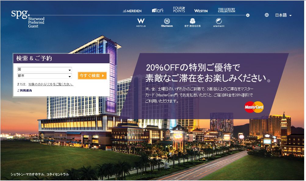 2013-06-20 SPG 週末2連泊以上で20%OFF ホテル修行 木、金、土曜日のいずれかのご到着で、2連泊以上のご滞在をマスターカード (MasterCardR) でお支払をいただくと、ご宿泊料金を20%割引でご利用いただけます。 結構安いです! http://www.spg-asiapacific.com/save20/jp/?EM=VTY_SPG_MASTERCARDSAVE20JP_PROMOTION メールマガジン、是非登録お願いします。 http://www.mag2.com/m/0000238211.html