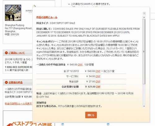 2013-12-18 IHG インタコが50%OFF? ホテル修行 IHG インタコが50%OFF? 年末の宿泊で、上海のインタコの値段見てたら50%OFFのレートが出てました! 他でもやってるのかな? これはお得です。 メールマガジン、是非登録お願いします。 http://www.mag2.com/m/0000238211.html