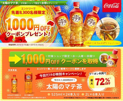 2015-05-15 太陽のマテ茶が1000円引きとなるクーポン先着8300名 お得情報 これは安い。 2Lのが6本で350円くらい、送料込みで買えてしまいます。。。 メールマガジン、是非登録お願いします。 http://www.mag2.com/m/0000238211.html